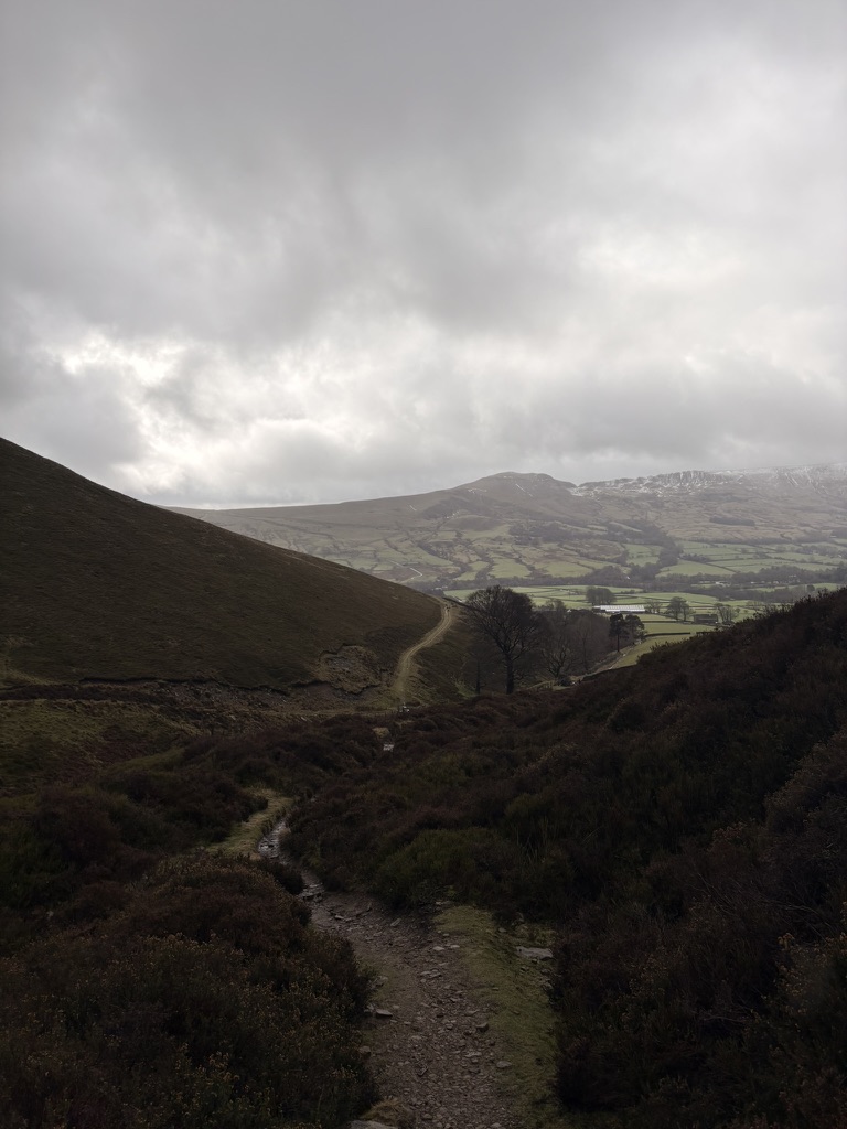Leaving Edale with Kinder Scout ahead under low cloud.
