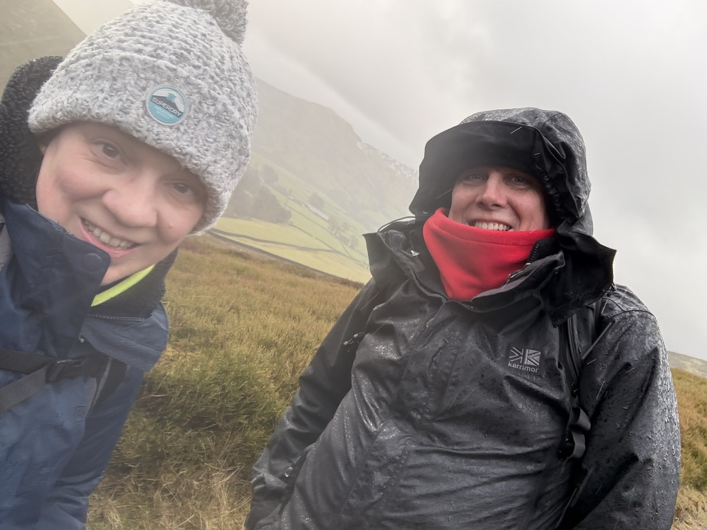 Our first moment on the Kinder edge — greeted by wind, hail and sleet.